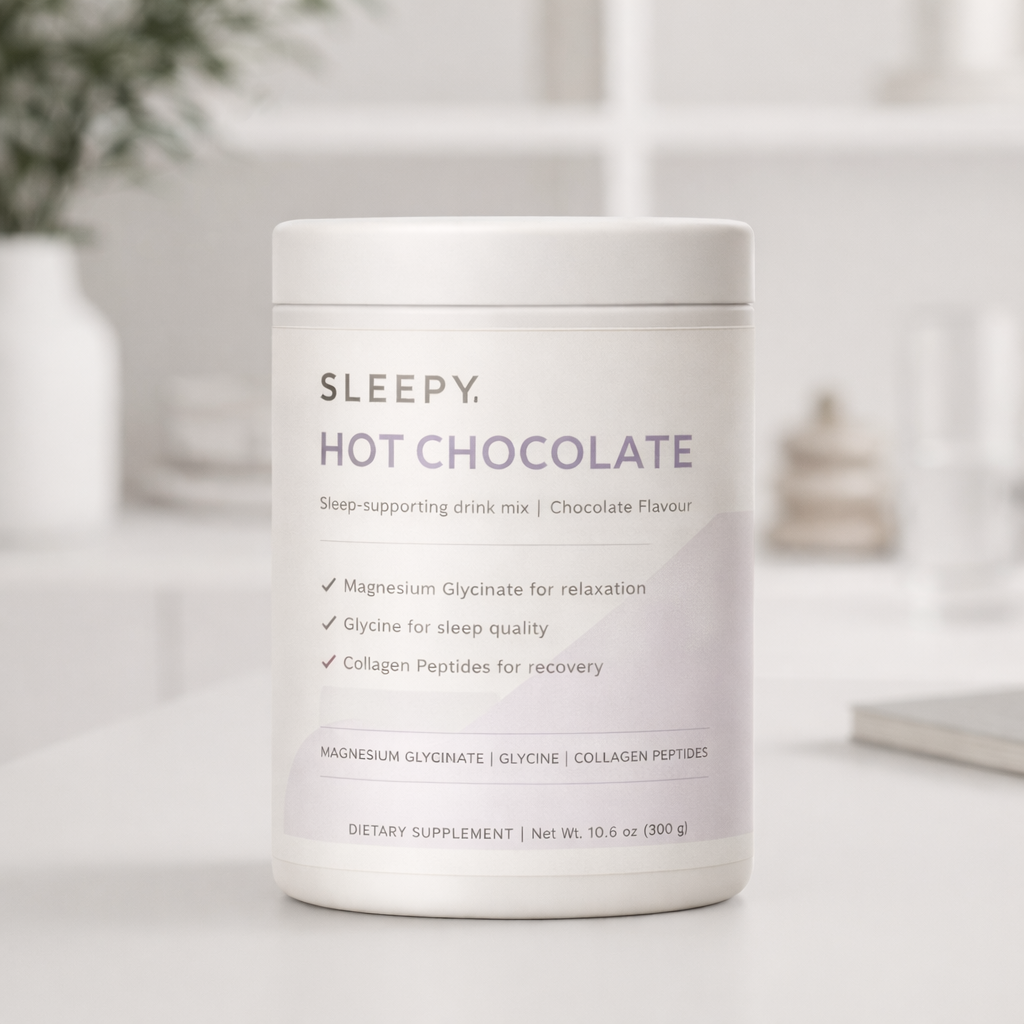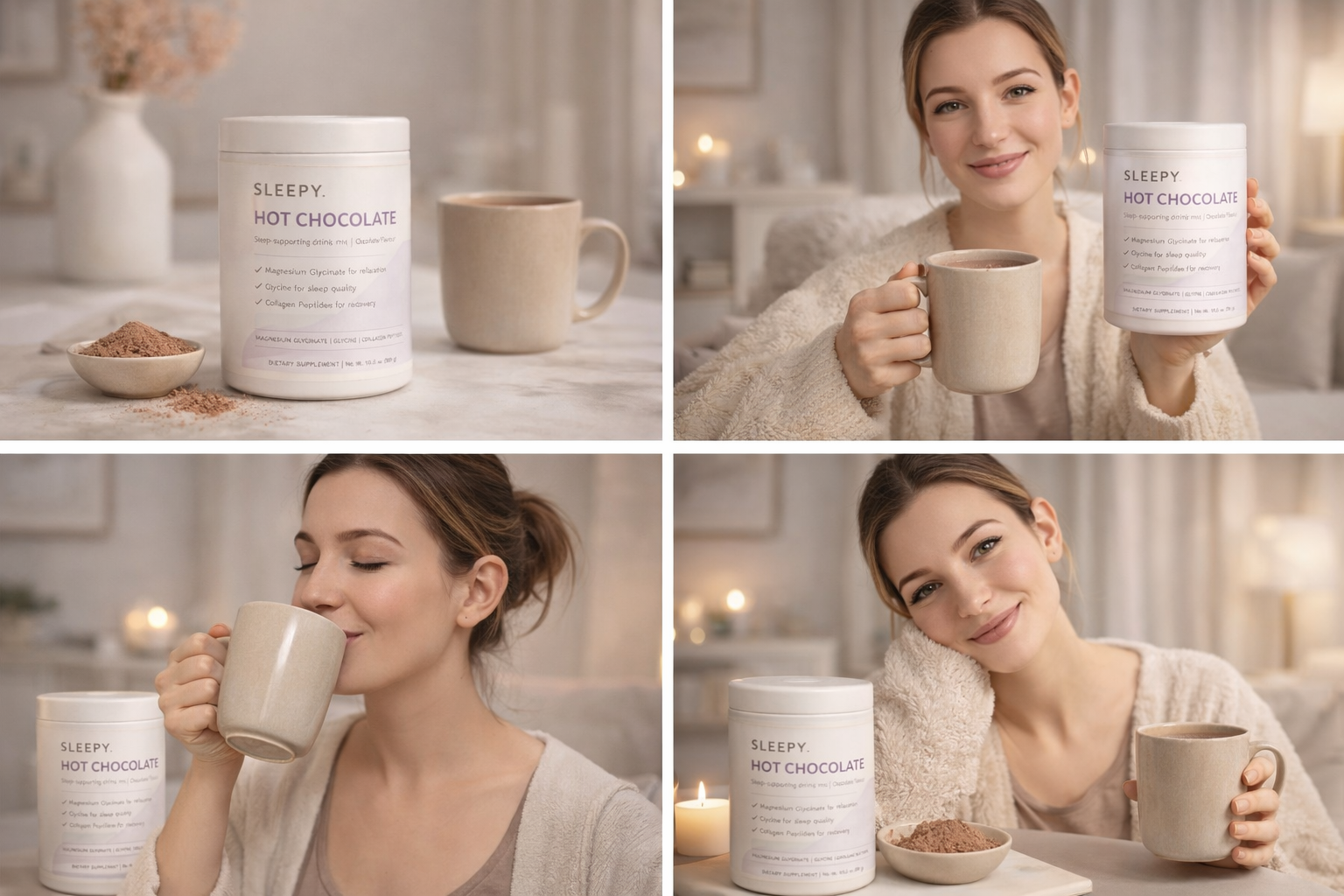A premium powdered functional beverage developed for brands looking to launch a sleep-support SKU with strong consumer appeal. The formula combines a comforting chocolate format with a blend of magnesium glycinate, glycine, collagen peptides, and tart cherry powder in a convenient once-daily serve.